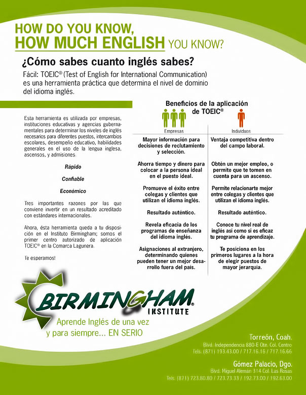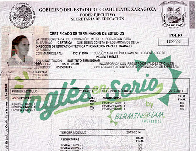 Birmingham Institute está acreditado ante la Secretaria de Educación Pública mediante el acuerdo de Reconocimiento de Validez Oficial al Curso de Inglés número 0525081743 desde el 30 de abril de 2008.